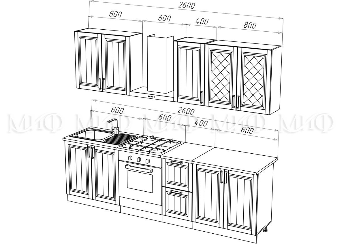 - Глубина шкафов: Верхние 300 мм/Нижние 600 мм/Глубина столешницы 600 мм