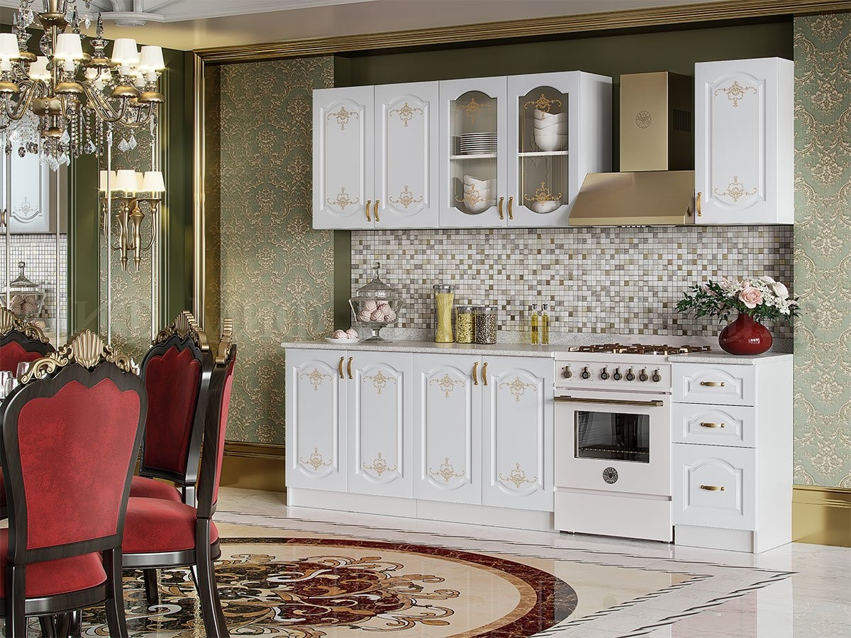 • Классическая кухня «Версаль» очарует вас своим исполнением и красивой цветовой гаммой. Ненавязчивый, нежный рисунок на фасаде идеально гармонирует со стилем и дизайном кухни. С таким кухонным гарнитуром не стыдно принять гостей и приятно провести время в семейном кругу или с друзьями.