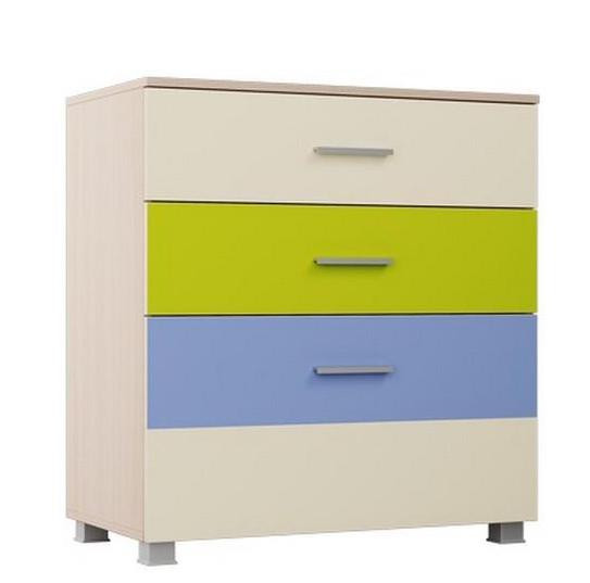 • Комод состоит из двух небольших взаимозаменяемых выдвижных ящиков, цвет фасадов Бежевый и ЛАЙМ и одного глубокого выдвижного ящика, фасад на котором сборный, состоящий из двух фасадов, цвет Синий  и Бежевый.