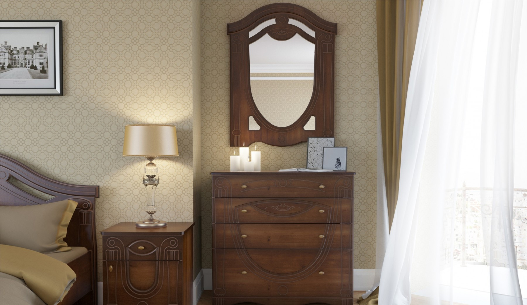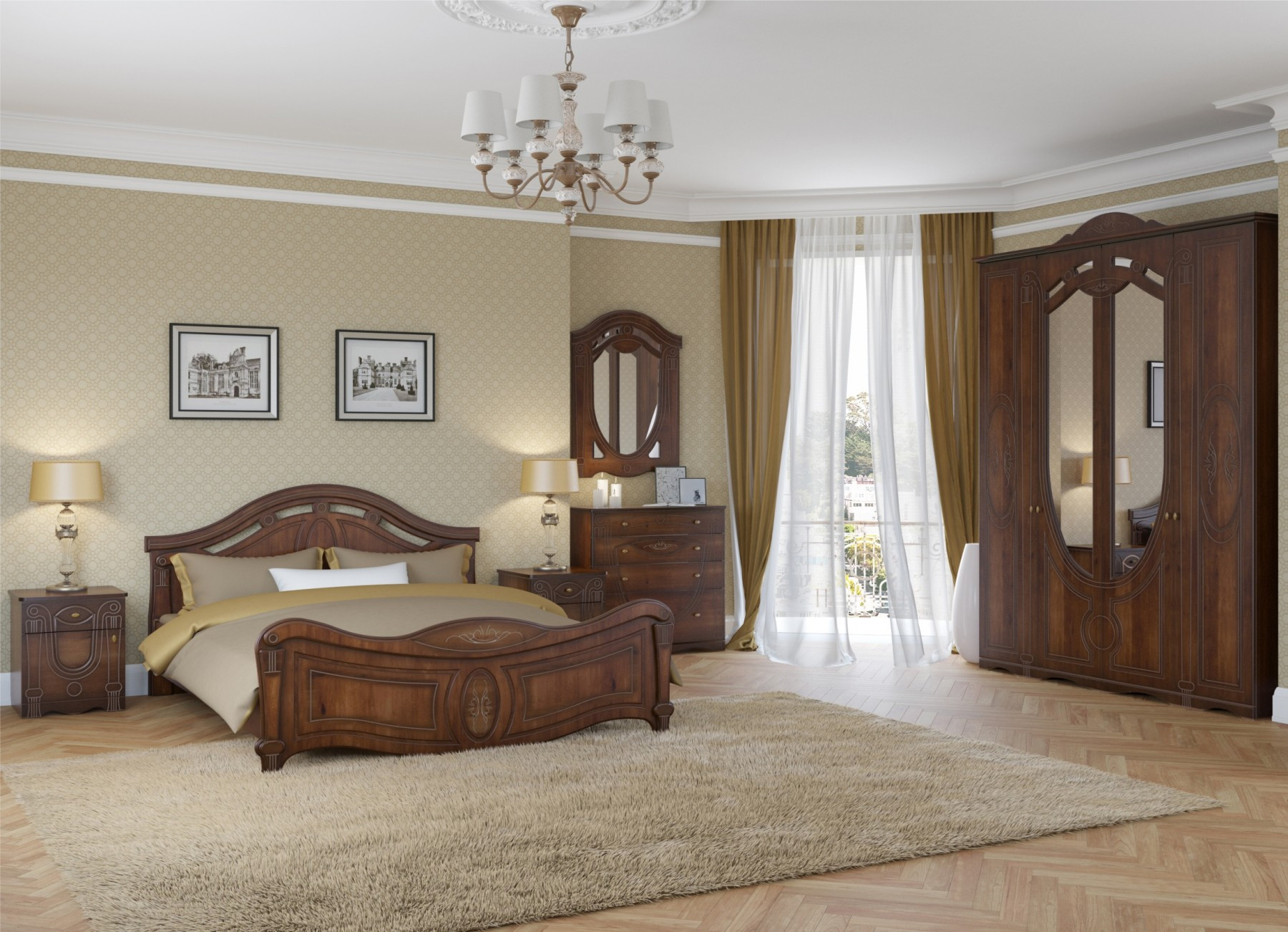 Спальня "Александрина" создаст самый уютный уголок в Вашем доме. Классический дизайн с патинированными фасадами и фасадами цвета орех подчеркнут изысканность интерьера. Основание кровати из стального каркаса обеспечит надежность и удобство на долгие годы. В такой обстановке приятно провести время!